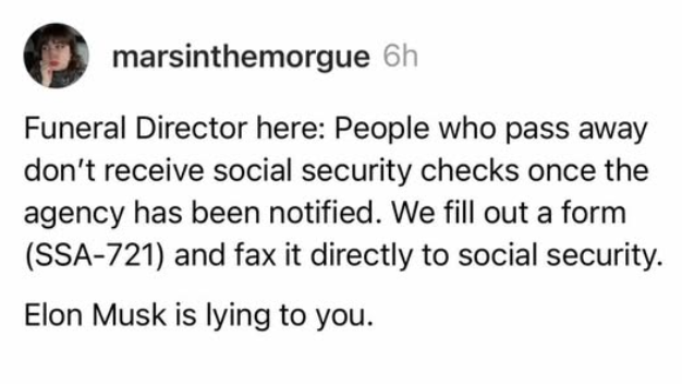 Are there people who believe Elon Musk’s claims that millions of dead American are receiving Social Security checks?  Of course.