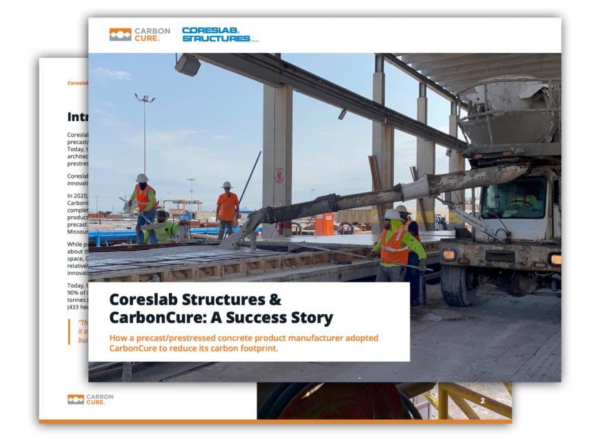 Read our Coreslab Structures case study: Coreslab demonstrated its sustainability leadership by adopting CarbonCure Precast technology in 2020 at its Texas facility where it manufactures a complete line of architectural and structural precast building products for parking garages, architectural cladding and total precast building solutions.