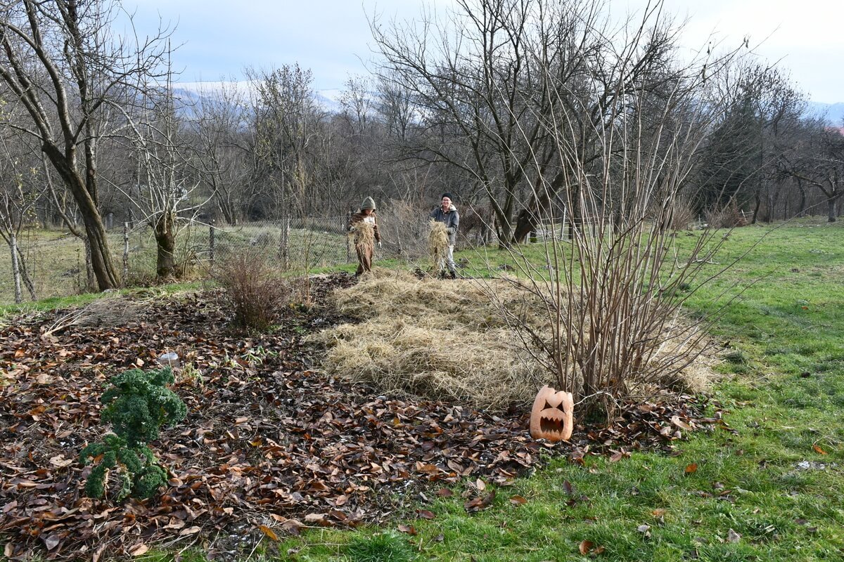 In our garden, we primarily use hay from grass which we cut by hand, simply because that’s what we have in abundance.