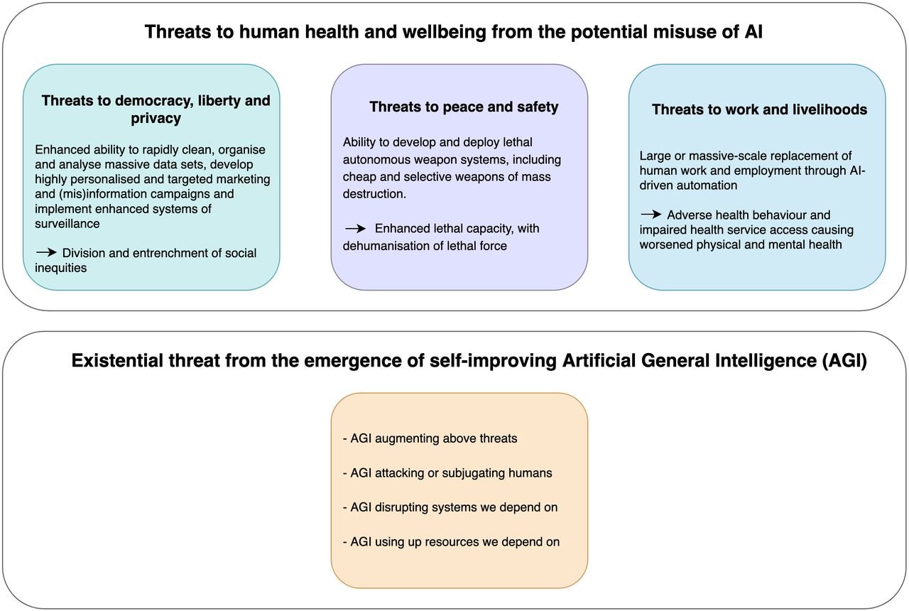 Figure 1 Threats posed by the potential misuse of artificial intelligence (AI) to human health and well-being, and existential-level threats to humanity posed by self-improving artificial general intelligence (AGI).  Cited from Federspiel F, Mitchell R, Asokan A, et al. Threats by artificial intelligence to human health and human existence. BMJ Global Health 2023;8:e010435. doi:10.1136/ bmjgh-2022-010435