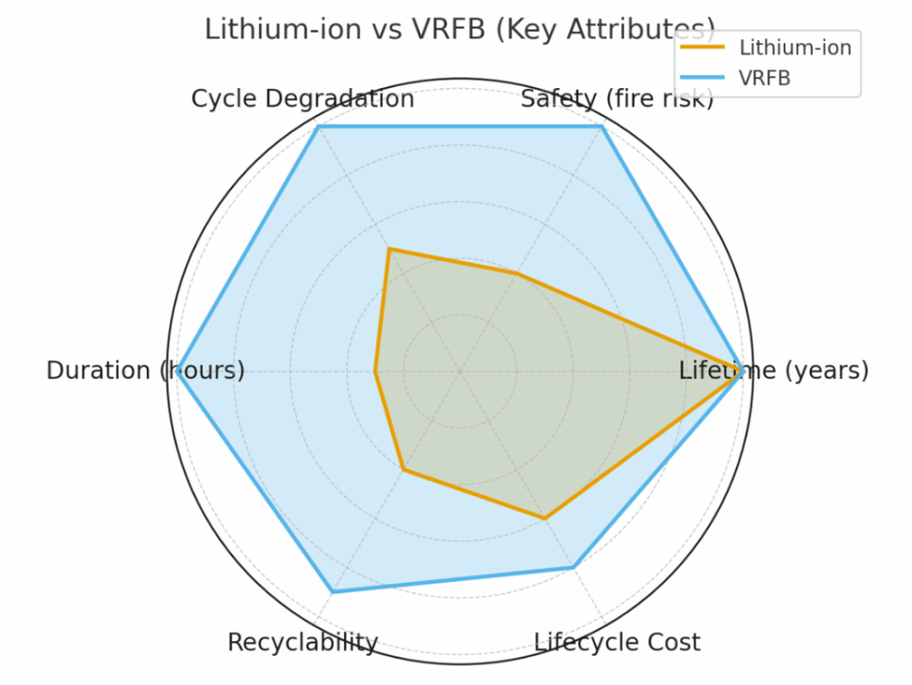 The economics increasingly favor flow batteries for long-duration applications. While lithium-ion costs less upfront per kWh, total lifecycle costs converge when factoring in replacement, degradation, and safety infrastructure. More importantly, VRFBs’ 10-hour duration unlocks new revenue strategies. A VRFB system can shift entire renewable generation periods, not just peak shave. It can provide overnight firming for solar facilities. It can participate in multi-day resilience contracts that lithium cannot fulfill.