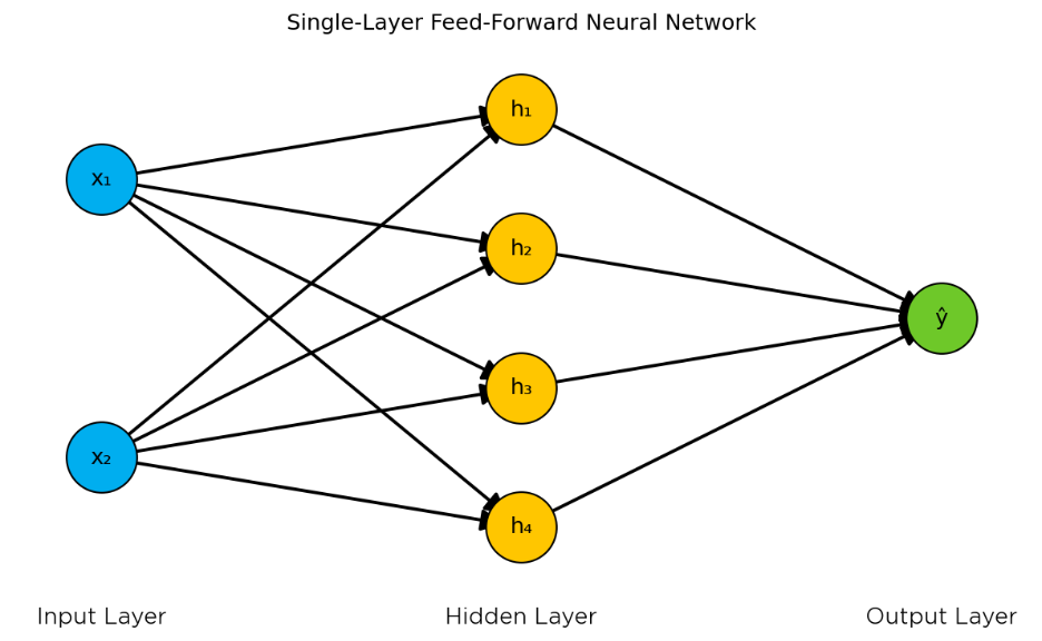 Before I discuss what AI is in a literal sense, I should clarify what is meant by AI more generally. The figure above is a simplified guide to the expansive field of AI. Broadly, AI can refer to any system that attempts to replicate human intelligence. Under the umbrella of AI is the field of machine learning (ML). The idea of machine learning is to make predictions in new situations by applying statistical algorithms to known data. Recommendation algorithms are a popular example of machine learning, used by companies like Netflix or Spotify. There is a veritable zoo of algorithms that vary according to the kinds of data being used and the questions asked of those data. However, one of the most popular algorithms is called a “neural network”—so-called because it was inspired by the neurons in a brain. The figure below depicts a simple neural network.