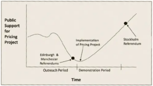 Congestion pricing proponents have always known the odds. Taxes are unpopular, check. Driving is a birthright and change is hard, check. We were aware congestion pricing in London and Stockholm had only 40 percent favorability before adoption. But both cities’ experience showed that once traffic visibly lessened and transit improvements got underway, opinion flipped. Roughly 60 percent of residents now support the tolls.