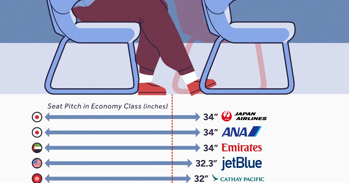 Japan Airlines and All Nippon Airways (ANA) top the ranking, each offering 34 inches of legroom in economy class.