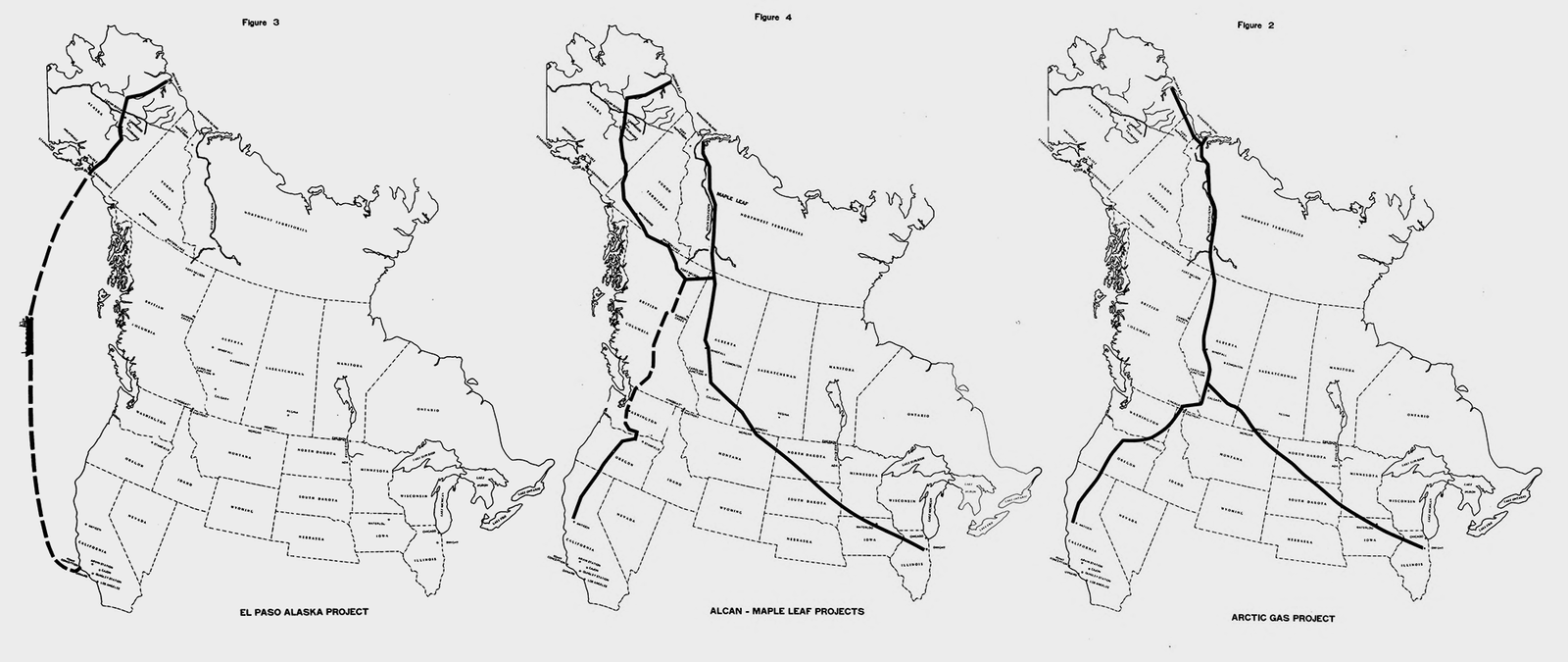 Three competing gas pipeline proposals (El Paso, Alcan, and Arctic Gas) spark 253 days of federal hearings. None are approved.