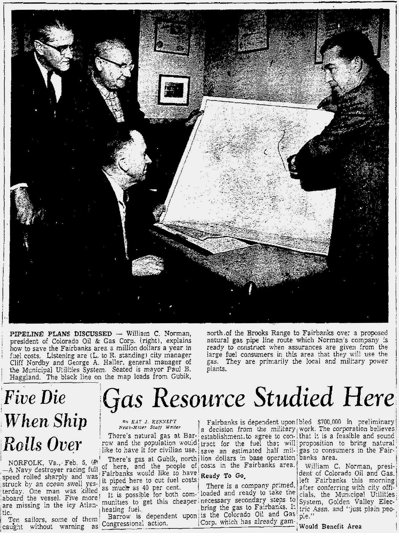 By the 1950s, this resource caught the attention of a world hungry for energy. As the race to tap the state’s vast oil and gas reserves got underway, Colorado Oil and Gas Corp. became the first to propose a natural gas pipeline from the northernmost reaches of the state to the city of Fairbanks. It was never built, but gas soon flowed to U.S. Navy facilities on the North Slope, even as Indigenous communities were barred from tapping it.