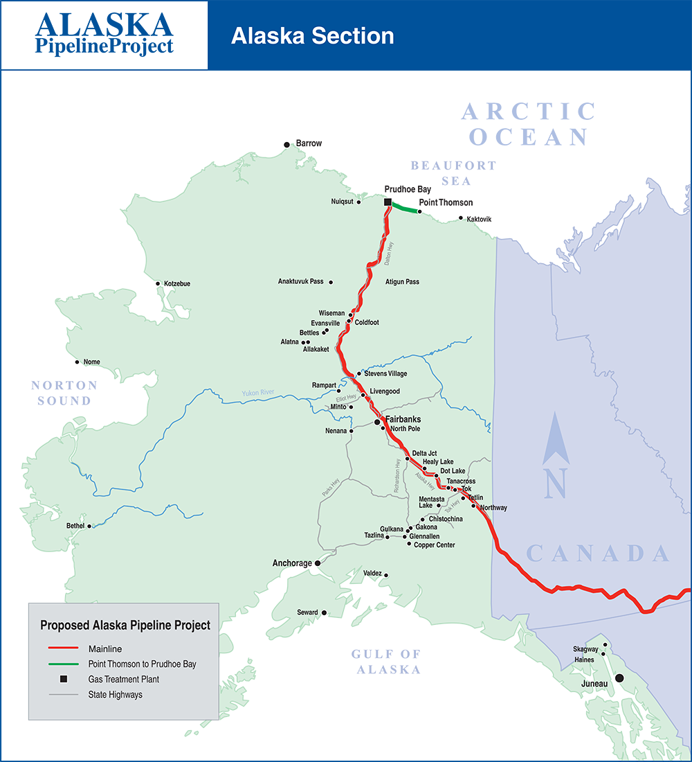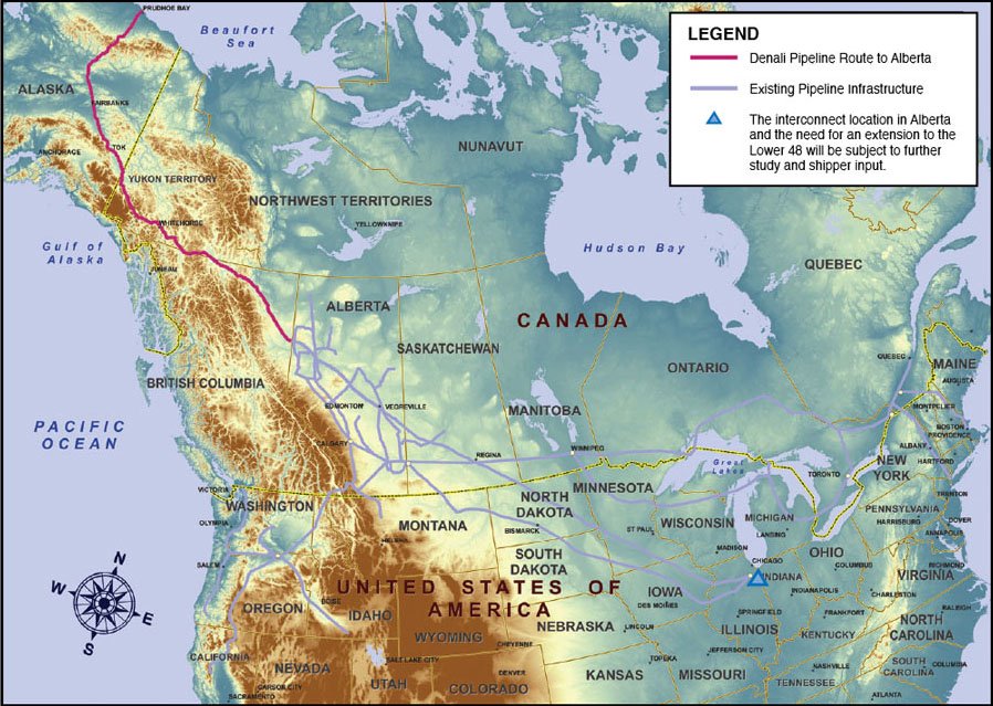 a map showing hte location of a proposed gas pipeline from the North Slope of Alaska to the south