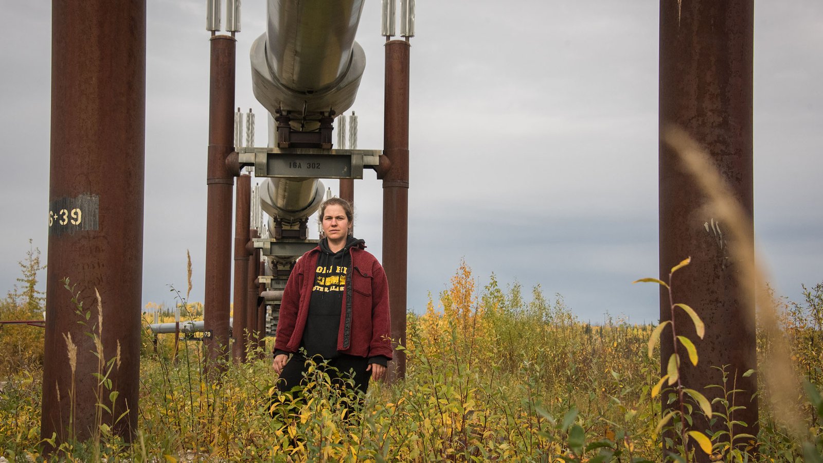 Sarah Furman, co-executive director of Fairbanks Climate Action Coalition, stands under the old Trans-Alaska Pipeline. Lois Parshley / Grist