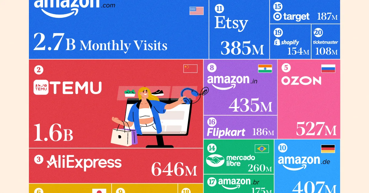 The visualization highlights how both U.S. and Chinese platforms anchor global digital shopping traffic, with combined shares around 65%. Despite the rise of emerging platforms like Temu, the e-commerce hierarchy remains relatively stable, showing Amazon’s enduring brand and infrastructure advantage.