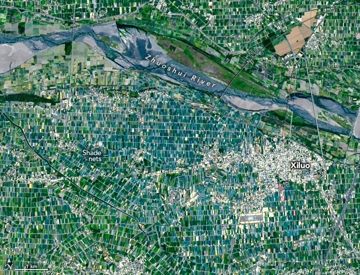 Another area that stands out in the mosaicked agricultural landscape of Yunlin is located around Xiluo (above). Here the fields take on an unusual greenish-blue hue, largely because of the ubiquity of shade nets. Farmers use the nets to protect crops from heat, sun, heavy rains, and pests. They’re generally deployed for specialty crops such as vegetables, fruit, and flowers. This area contrasts with the darker green region in the lower right of the first image, where rice is the dominant crop.