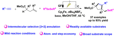 We have developed a mild and effective electrocatalytic three-component cyclization reaction of terminal alkynes, allyl dimethyl esters, and diselenides to synthesize valuable selenium-containing cyclopentene derivatives.