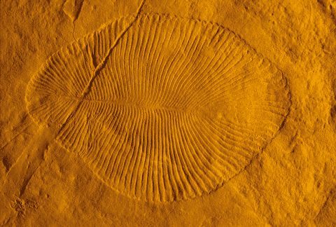 Photograph of a rounded, flattish fossilized organism with lines around its perimeter embedded in yellowish rock“Photograph of a cast of Dickinsonia costata, an organism that lived ~560 million years ago, during the Ediacaran Period. The fossil was found at Flinders Ranges in South Australia. (Courtesy: Shuhai Xiao, Virginia Tech)”