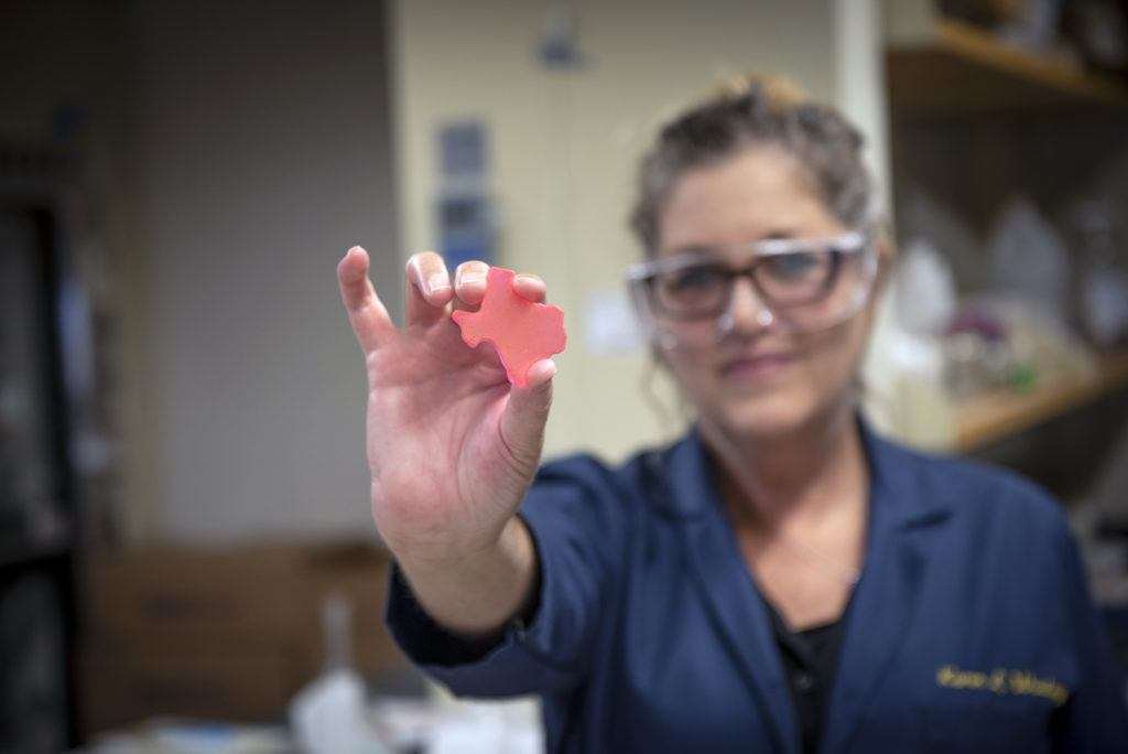 A woman in dark blue laboratory smocks and wearing glasses, facing the camera, holds in front of her a small piece of pink material, a curved fragment of something like plastic, as if showing it to the camera, with the extended hand and material appearing in focus while the rest of the woman and surrounding lab environment are slightly out of focus