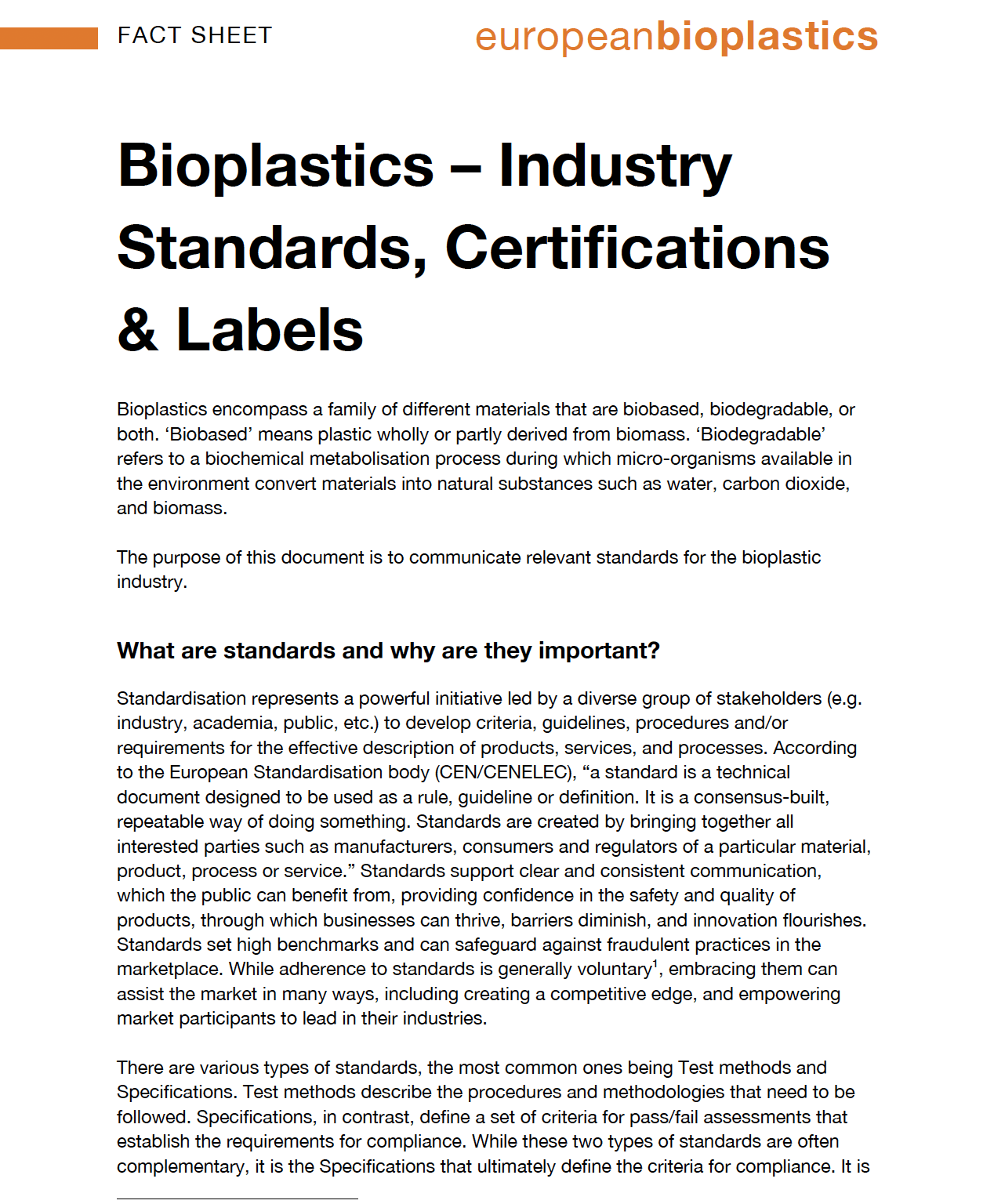 The purpose of this document is to communicate relevant standards for the bioplastic industry.