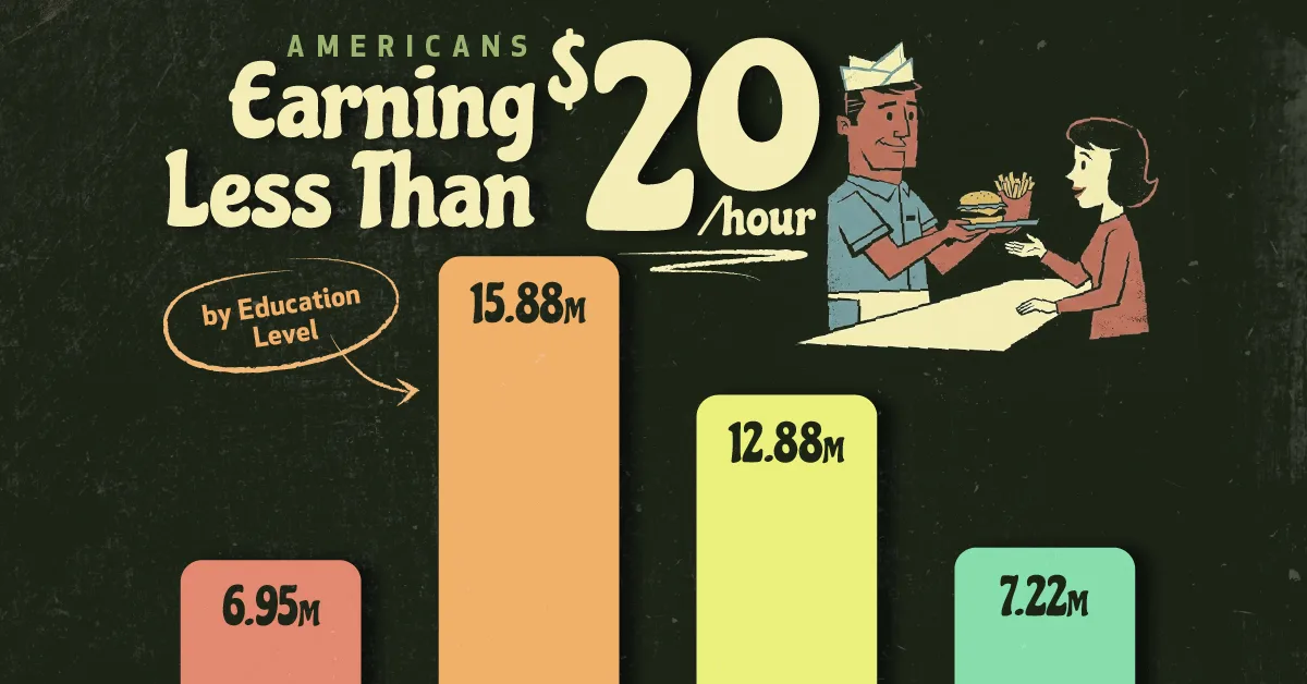 Despite a strong labor market and rising nominal wages, there are still millions of people taking home less than $20 per hour on average. Education plays a major role in determining earnings, but it does not guarantee high wages—or even employment.