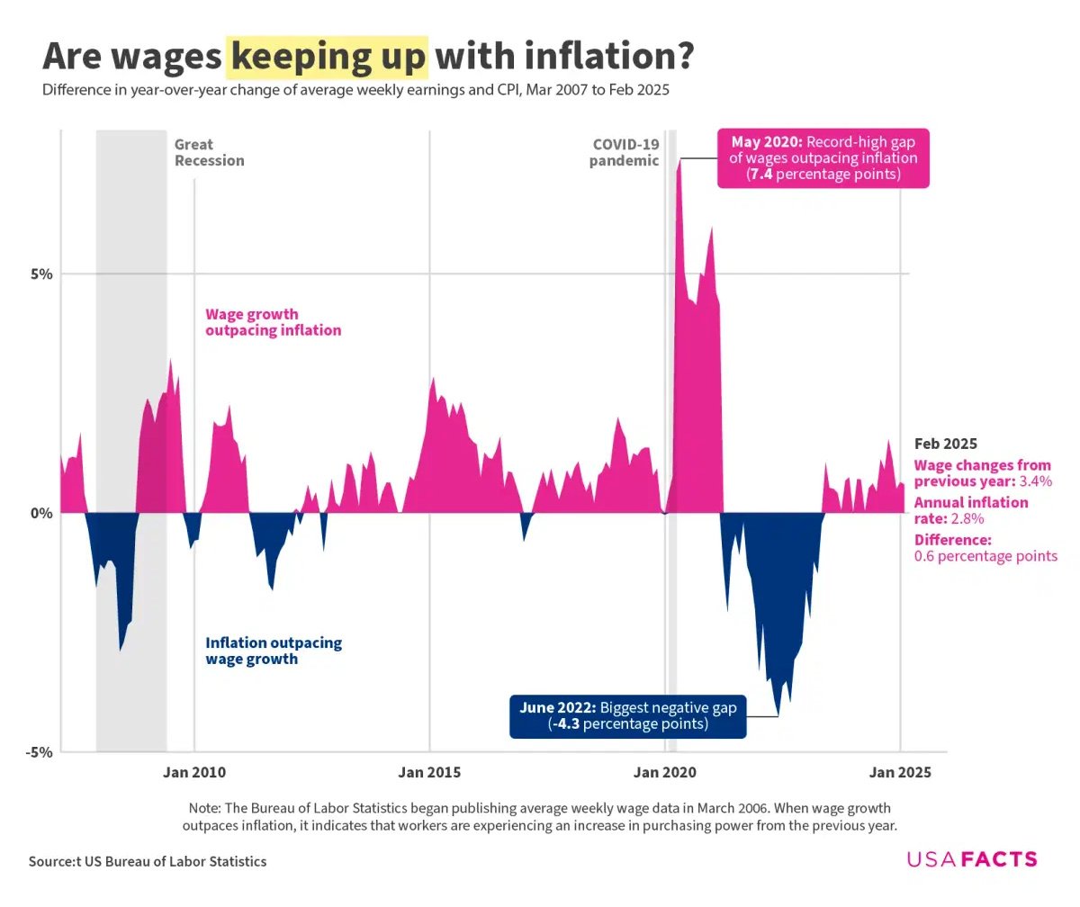 The U.S. Bureau of Labor Statistics (BLS) tracks average weekly earnings and inflation, allowing analysts to assess whether wages are keeping pace with rising prices. A recent visualization by USAFacts maps year-over-year wage growth against inflation from 2007 to 2025.