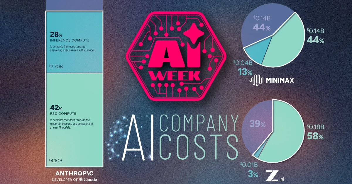 This chart from Visual Capitalist’s AI Week, sponsored by Terzo, uses Epoch AI data to compare spending at Anthropic, Minimax, and Z.ai across R&D compute, inference compute, and staff plus other costs.