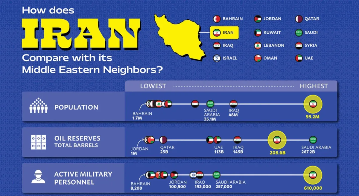 Iran is often seen as a major power in the Middle East, but how does it compare to its neighbors? By population, energy resources, and military size, it ranks among the region’s largest players, yet it falls behind wealthier states on economic output per person and defense spending.