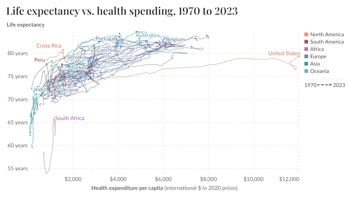 Today’s visual from Our World in Data that compares life expectancy with healthcare spending per capita hints at exactly this paradox.
