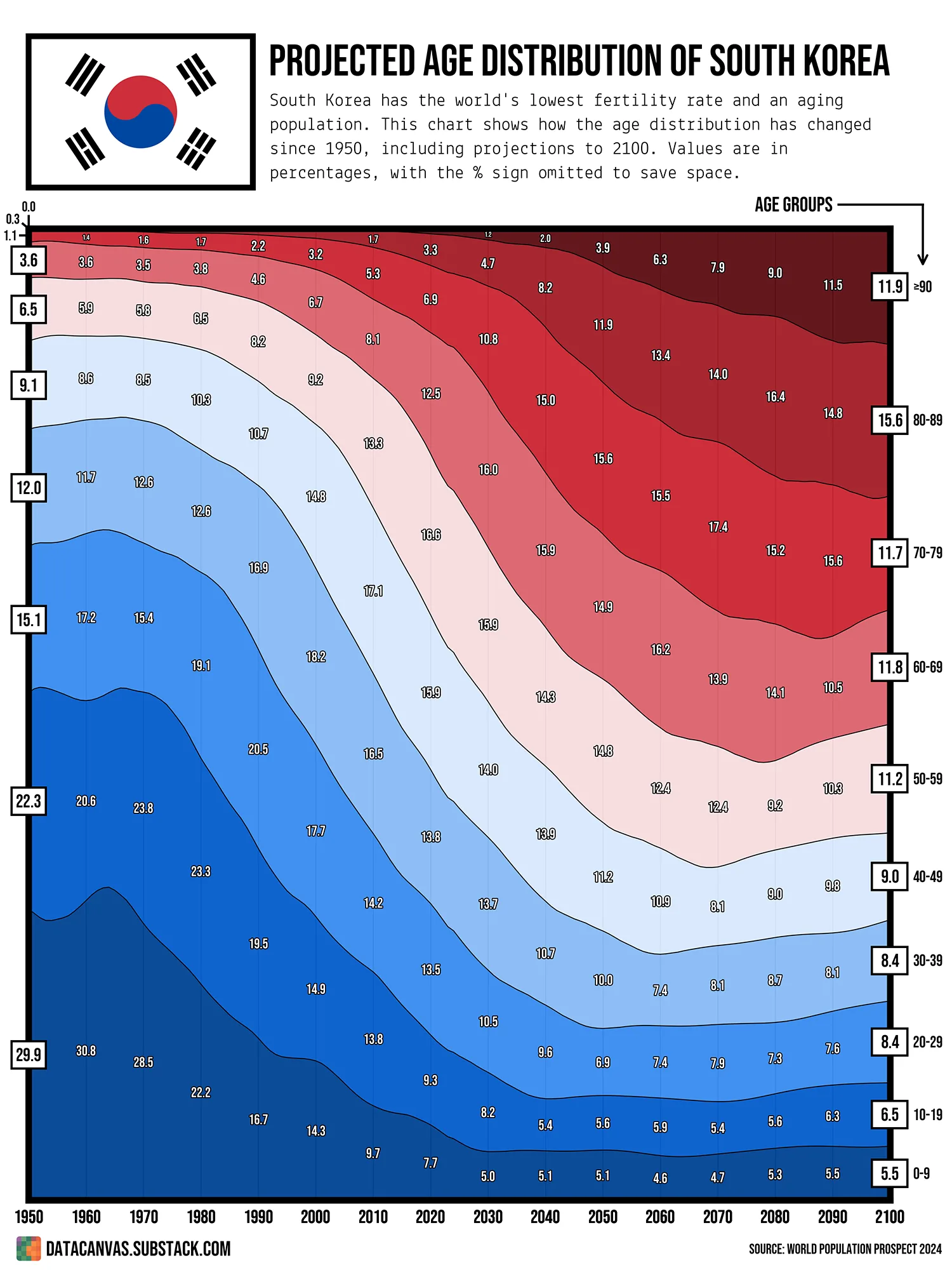 This visualization, created by Oscar Leo of DataCanvas using data from the UN World Population Prospects 2024, shows how South Korea’s age distribution evolves year by year across a 150-year span.