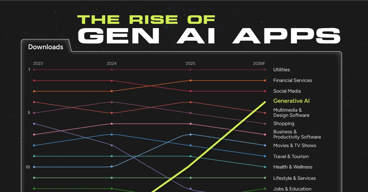 - By 2026, Gen AI is expected to rank among the top five mobile app categories by downloads, revenue, and time spent.