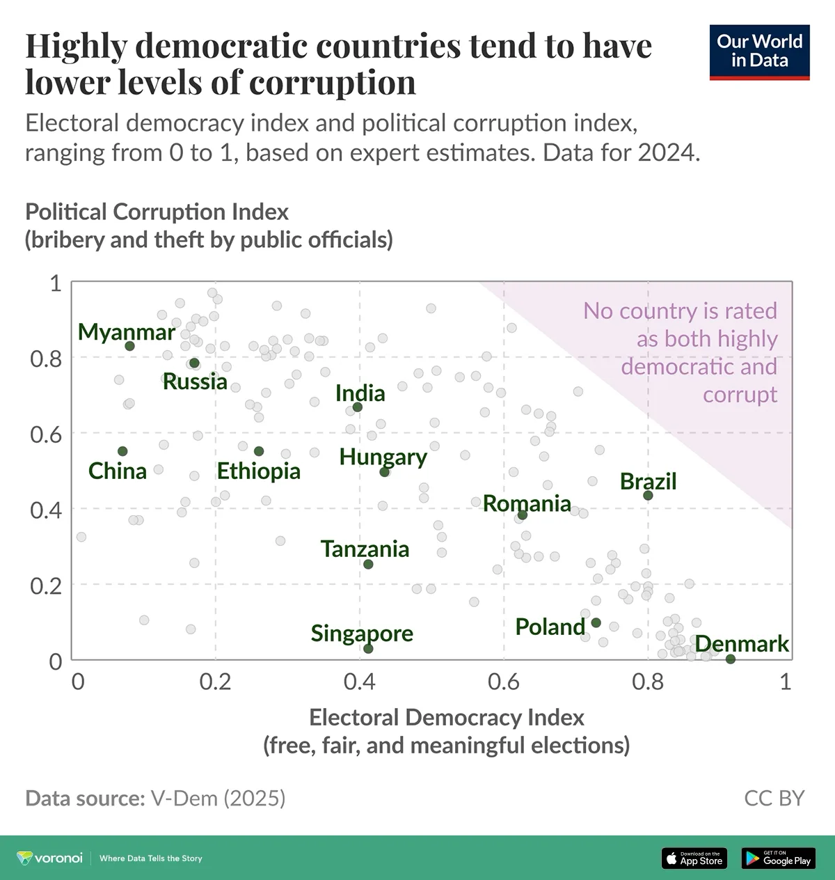 According to new data from the Varieties of Democracy (V-Dem) project and a visualization by Our World in Data, the correlation is clear: democratic societies tend to be less corrupt.