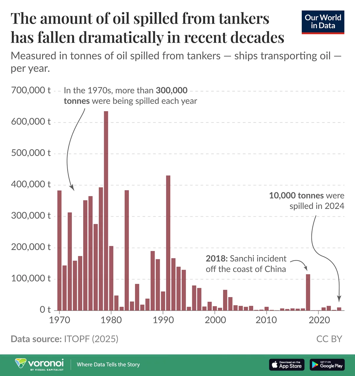 - Oil‑spills from tankers have fallen by more than 90% since the 1970s.
