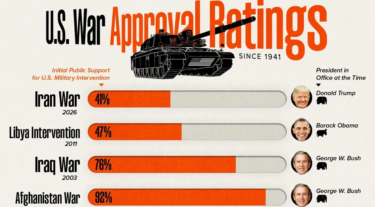 Support for the Libya intervention stood at just 47% in 2011, and the 2026 Iran conflict sits even lower at 41%, suggesting a growing reluctance among Americans to back new wars.