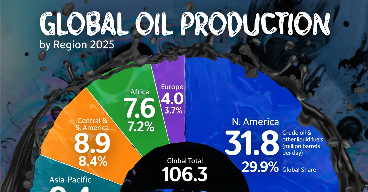 This graphic breaks down global oil production by region in 2025, based on EIA data.