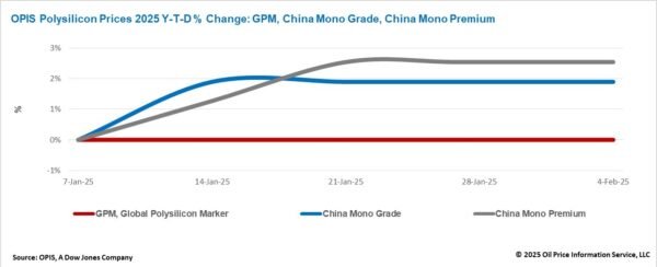 The China Mono Grade, OPIS’ assessment for mono-grade polysilicon prices within the country, remained stable this week at CNY 33.625 ($4.61)/kg, equivalent to CNY 0.076/W. Similarly, the China Mono Premium, OPIS’ price assessment for mono-grade polysilicon used in n-type ingot production, held steady at CNY 40.375/kg, or CNY 0.091/W. Both prices remained unchanged from the previous week due to the closure of the Chinese market for the Lunar New Year holiday.