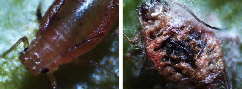 Before (left) and after (right) effects of parasitic wasp (Aphidius colemani) mummification of the green peach aphid (myzus persicae). The wasp’s life cycle requires soil for hatching and the tansy provides its first food source so wasps multiply to hunt down every single aphid they detect. Hint: identifying your specific pest is important in biocontrol.Â