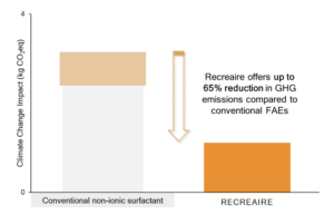 Advancing this technological change is Recreaire®, a CO₂-based surfactant platform that uses captured carbon dioxide as a raw material. This replaces traditional oleochemicals and a portion of fossil feedstocks with a renewable source of carbon. With Recreaire, surfactant producers can reduce climate change impact by up to 65% compared with conventional surfactants.
