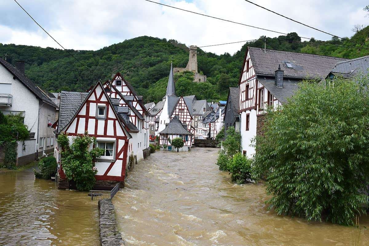 “<strong>Streets of water</strong> Monreal in Germany was one of many places in central Europe hit by extreme flooding caused heavy rainfall in July 2021. (Courtesy: Shutterstock/M Volk)”The models used by today’s social-tipping researchers have similarities with recent developments in network theory and critical transitions in physical systems. Van Ginkel’s road study, for instance, adopted a network percolation approach, which is used in physics to model phase transitions in materials. This approach can describe, for example, how a solution of polymers will turn into a rigid gel once enough chains have linked together, with the switch occurring at what is known as a “percolation point”.