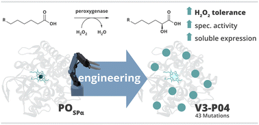 The performance of the CYP152 peroxygenase POSPα was substantially improved for the α-hydroxylation of medium-chain fatty acids by mutating oxidation-sensitive solvent exposed amino acids and exploiting computational tools.