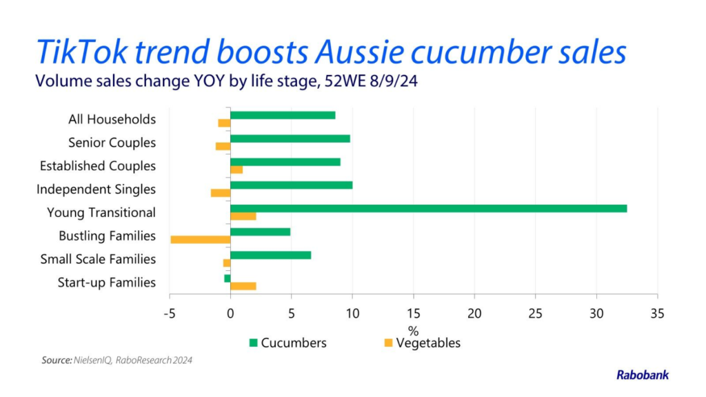 Check out the curiously continentally-shaped increase in cucumber sales among ‘young transitionals’ (Gen Zs) in the graph below, courtesy of Pia Piggot at RaboResearch.