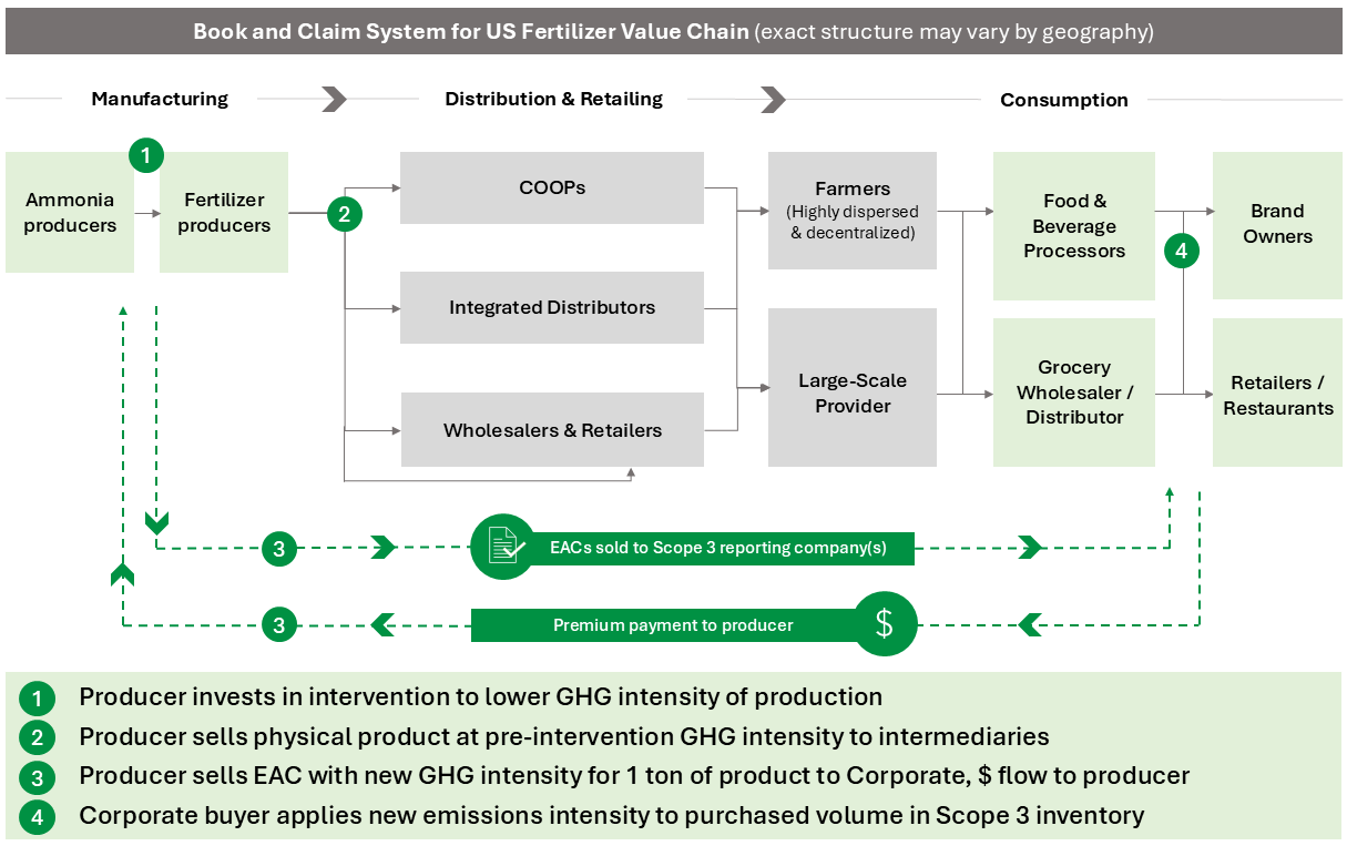Book-and-claim systems solve this challenge by decoupling environmental attributes from physical product flow. Under this framework, fertilizer producers generate Environmental Attribute Certificates (EACs) for each unit of low-emission production, which are then sold separately from the physical fertilizer itself (Exhibit 2). Corporate buyers purchase these certificates to demonstrate verified emissions reductions in their Scope 3 inventories, creating a direct financial channel between producers and corporate buyers — regardless of where the physical fertilizer ultimately flows through agricultural supply chains. This structure enables revenue to reach decarbonization projects without requiring companies to engage in complex coordination that alters how farmers source inputs or require that physical molecules are traced all the way through complex value chains.