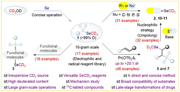 A concise, scalable and efficient process has been well established to access a library of Se-methyl-d3 reagents, which have been extensively applied to accomplish a series of high-efficiency transformations in a radical, electrophilic or nucleophilic manner.