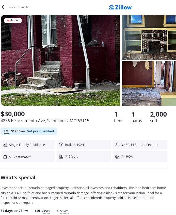 At least 10 severely damaged homes in the tornado’s path have gone up for sale on the real estate platform Zillow in recent weeks. Each one is labeled not as a home for locals to move into, but as an investment opportunity: 4641 Maffit Avenue “offers investment potential” for rehab or brick salvage, with a starting bid of $20,000; 4236 East Sacramento Avenue — “Investor Special!! Tornado damaged property” — in the historic Ville neighborhood is going for $30,000.