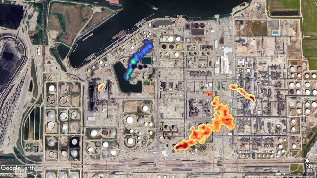Plumes of methane (blue) and CO2 (orange) observed from an oil and gas facility by Carbon Mapper airborne surveys.