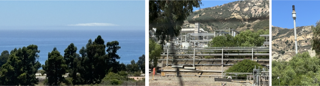 Santa Barbara coastline across Highway 101 from the Gaviota gas plant (left) and a portion of the Gaviota gas plant and flare stack, which are now idled (center and right).