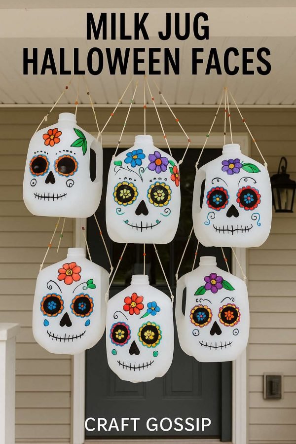 This project has become one of my favorite DIY Halloween decorations because it checks so many boxes: thrifty, creative, and surprisingly pretty for something made out of old milk jugs. Whether you’re decorating for trick-or-treaters, a fall party, or just want to add some seasonal cheer, these milk jug skeleton faces bring a Day of the Dead flair to your home.