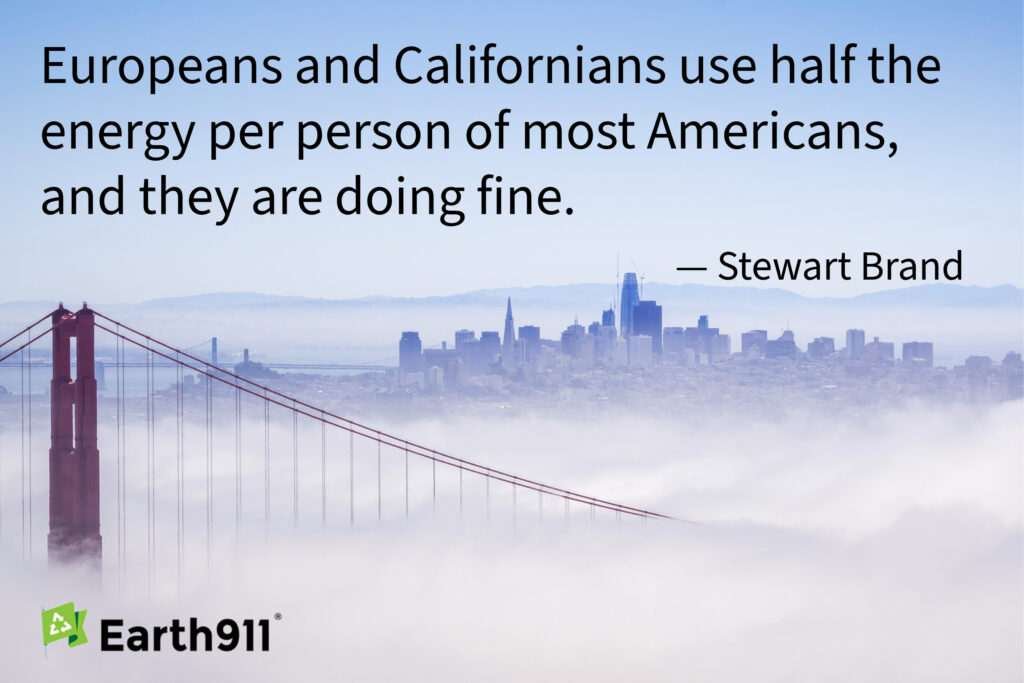 Stewart Brand, who popularized the “blue marble” photograph that changed humanity’s perspective on the fragility of the Earth, points out that Californians and Europeans use half the energy of the typical American, without losing any quality of life. This quote comes from Whole Earth Discipline: Why Dense Cities, Nuclear Power, Transgenic Crops, Restored Wildlands, and Geoengineering Are Necessary, and Brand is also the creator of the Whole Earth Catalog.
