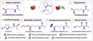 We report a greener and sustainable strategy for selective C–N bond cleavage of unstrained cyclic amines via a direct electricity-induced reduction, without using any redox mediator, to deliver δ-substituted amides and ketoamides.