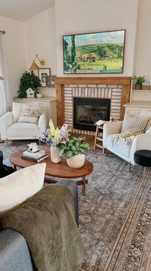 Lighting should be soft and warm, think table lamps with pleated shades or flickering candles. Incorporate vintage artwork, stacks of books, and natural elements like dried flowers in ceramic vases. A well-worn rug underfoot adds coziness, while open shelves displaying cherished items bring personality. The goal is to create a room that invites conversation, comfort, and calm.