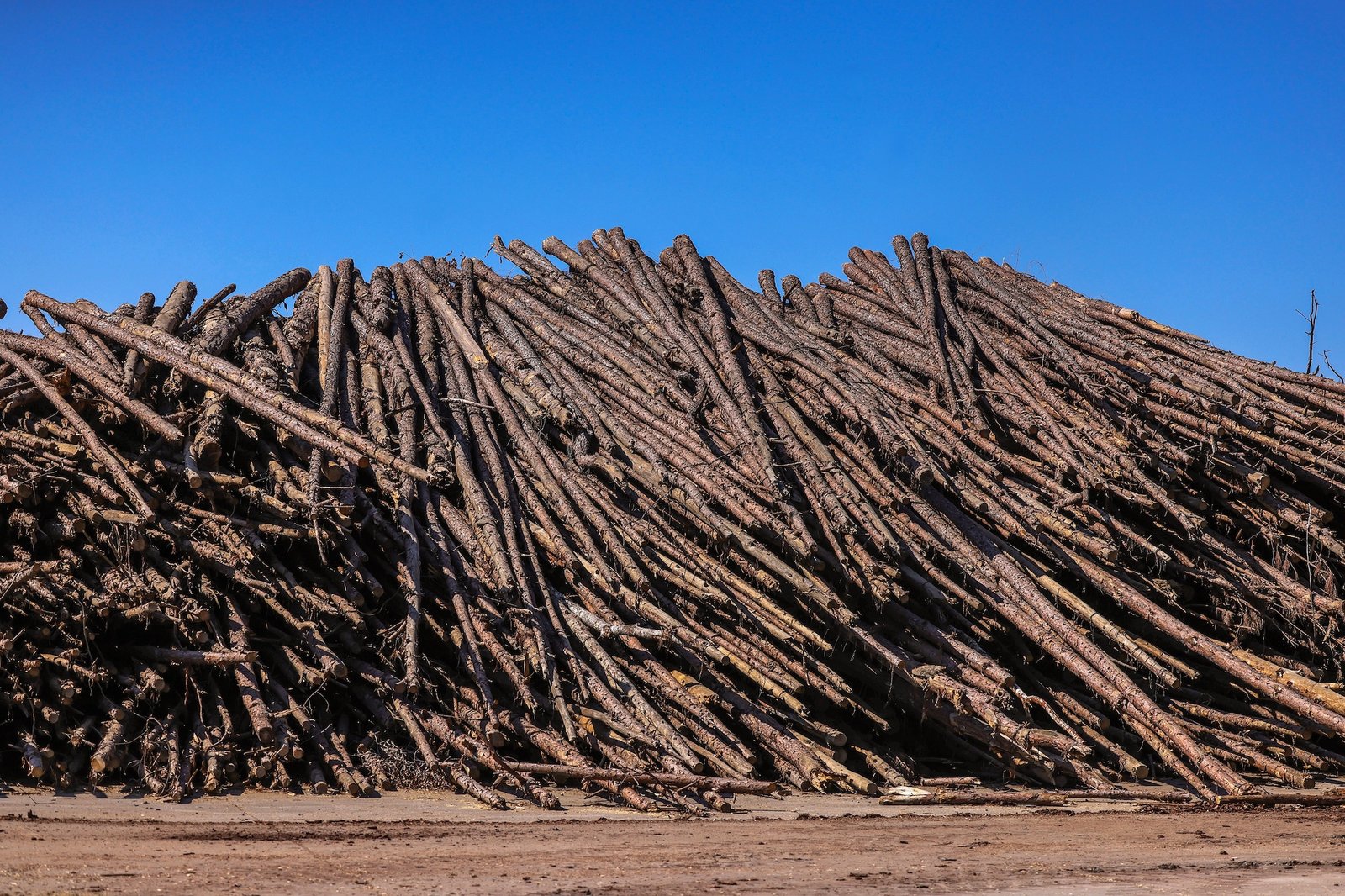Machines work near a large pile of cut logs