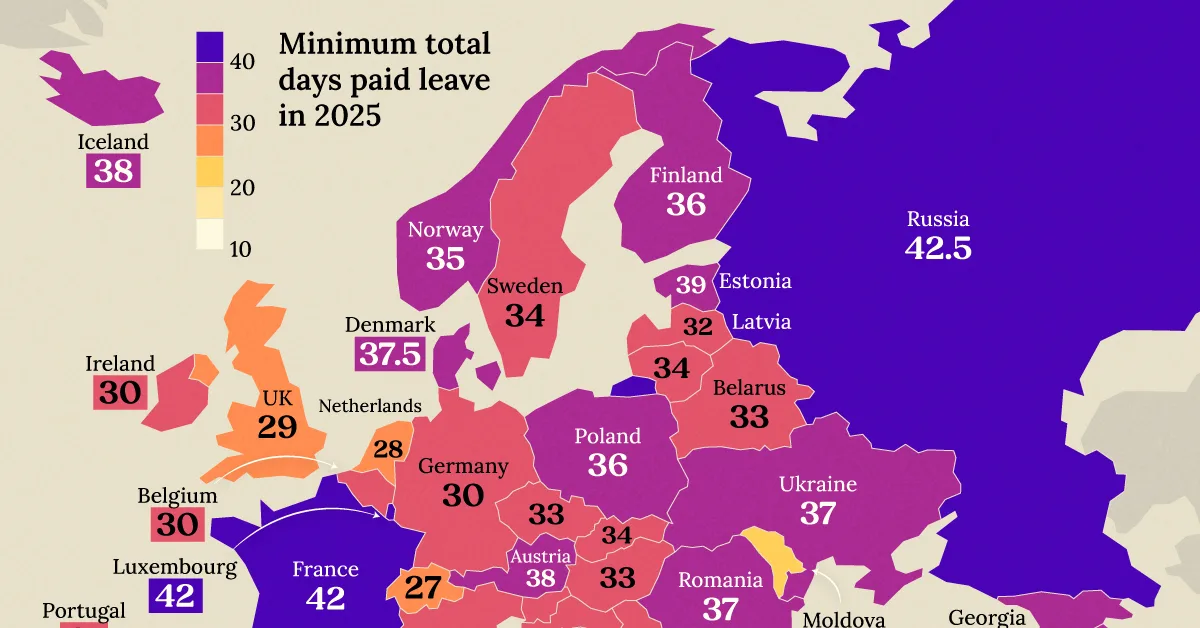 Mapped: Paid Vacation Days Across Europe