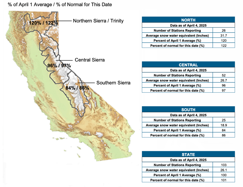 Last week’s snow survey confirmed what I saw in the mountains. The California Department of Water Resources reported that the state’s snowpack measured 96% of average at its peak on April 1. There is nuance, since the north got 120% and the south only 84%. We can say this is relatively good news, but we also have to remember that the last three years of near-average snowpack followed a severe drought from 2020 to 2022, the driest three-year period ever recorded in California.