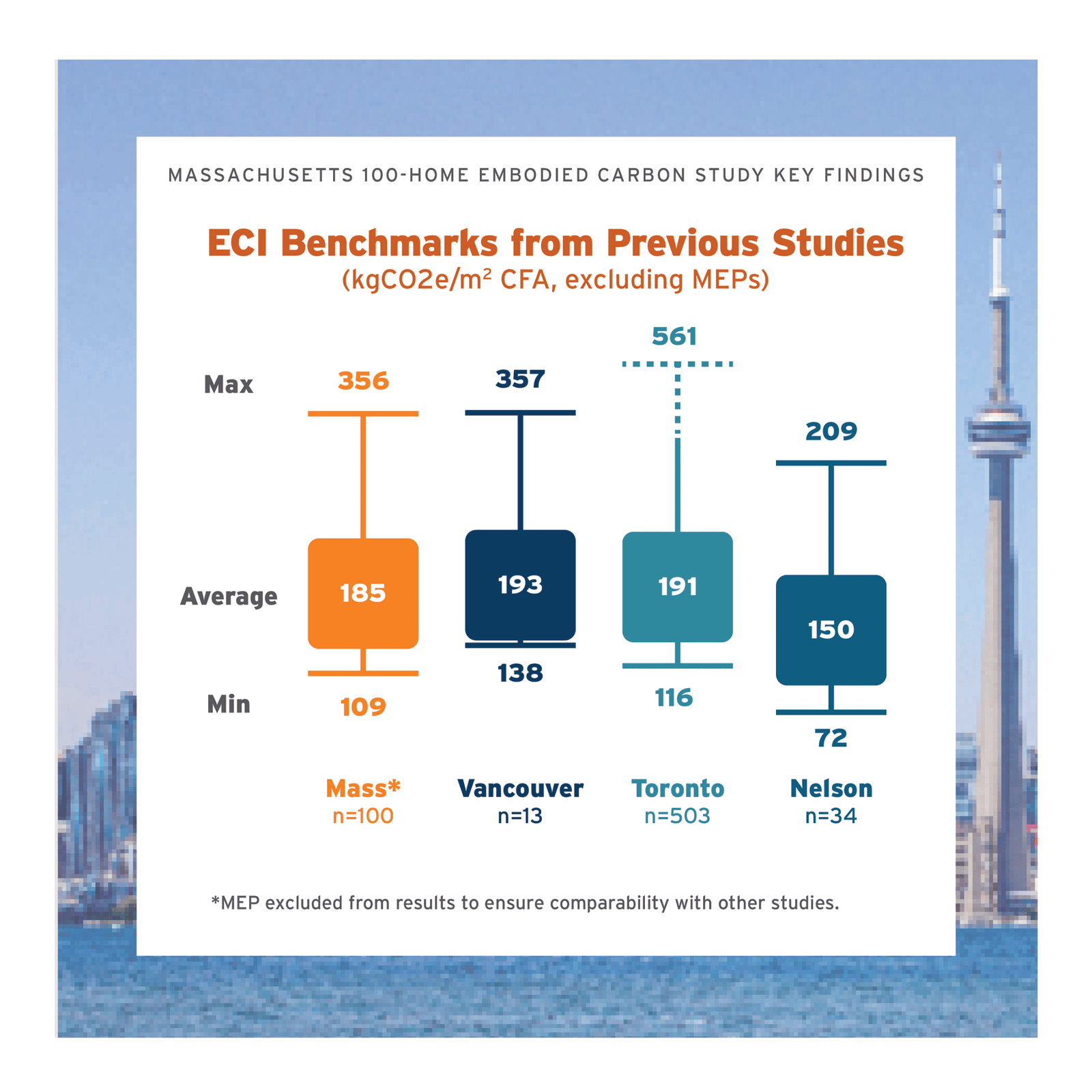 The outcomes of multi-home studies in Canada by Builders for Climate Action reveal average embodied carbon intensity (ECI) values comparable to those observed in Massachusetts. The results studies show similar outliers at both the high- and low- ends.