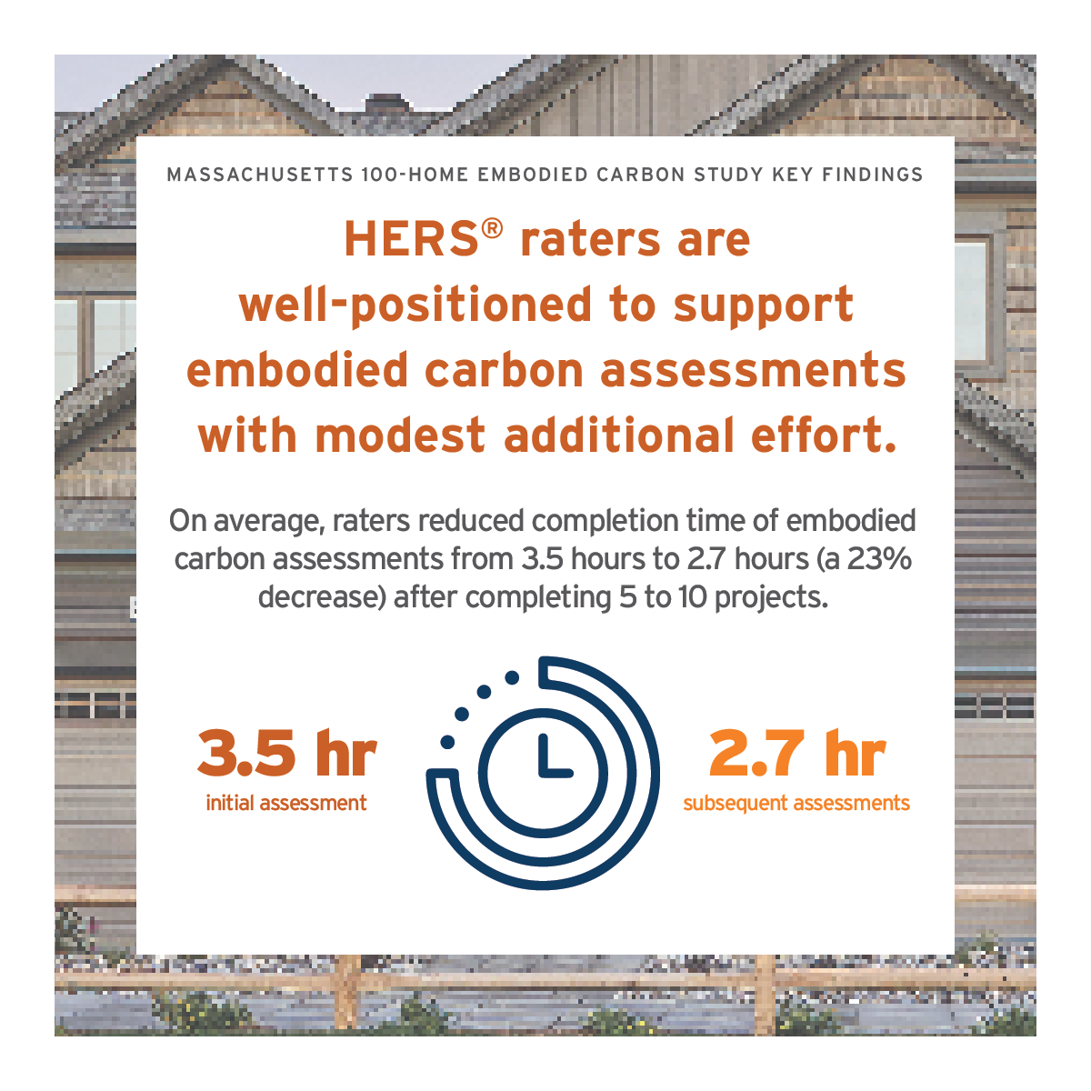 The HERS® Raters participating in this study were among the first in the industry to receive training to do embodied carbon assessments of new homes, and they did so using beta software integrations. Even at this early stage of training and software development, the time required to complete an embodied carbon assessment decreased by 23 percent to 2.7 hours per assessment. Some HERS® Raters were able to complete an embodied carbon assessment in 1–2 hours.