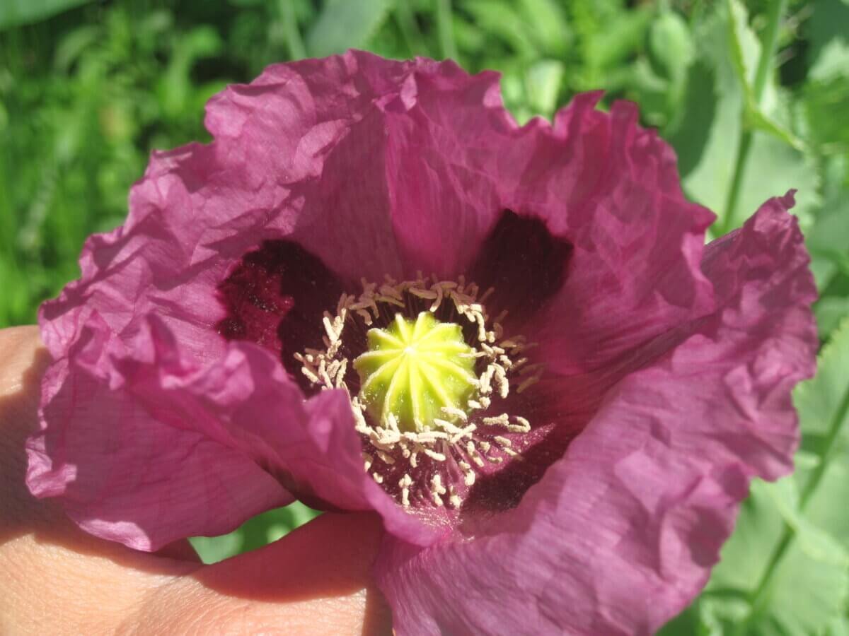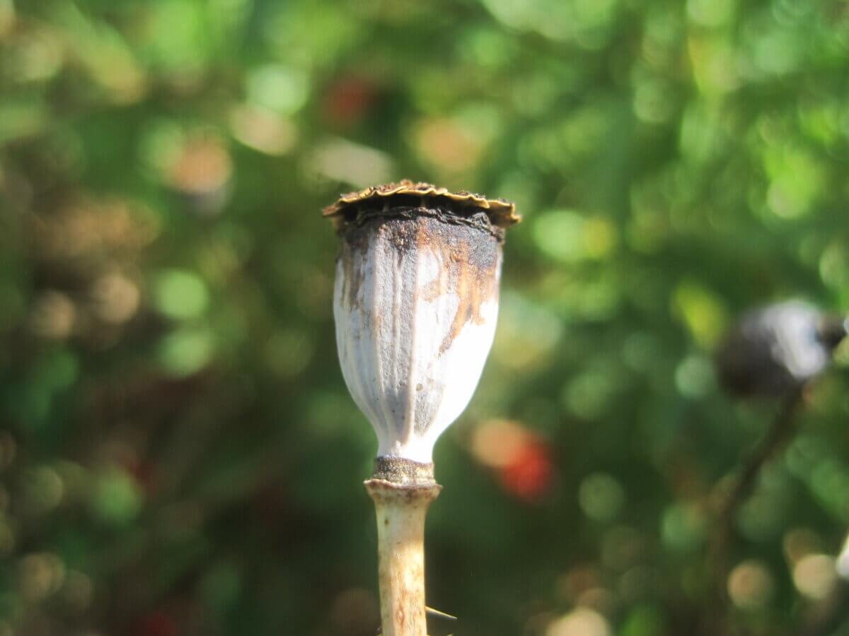 Corn Poppy seed capsule, ready to harvest (note the tiny vents have opened right underneath its “hat.” Photo courtesy of WRen Everett.